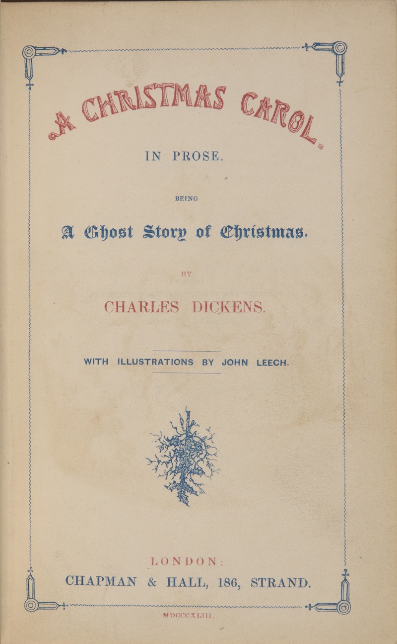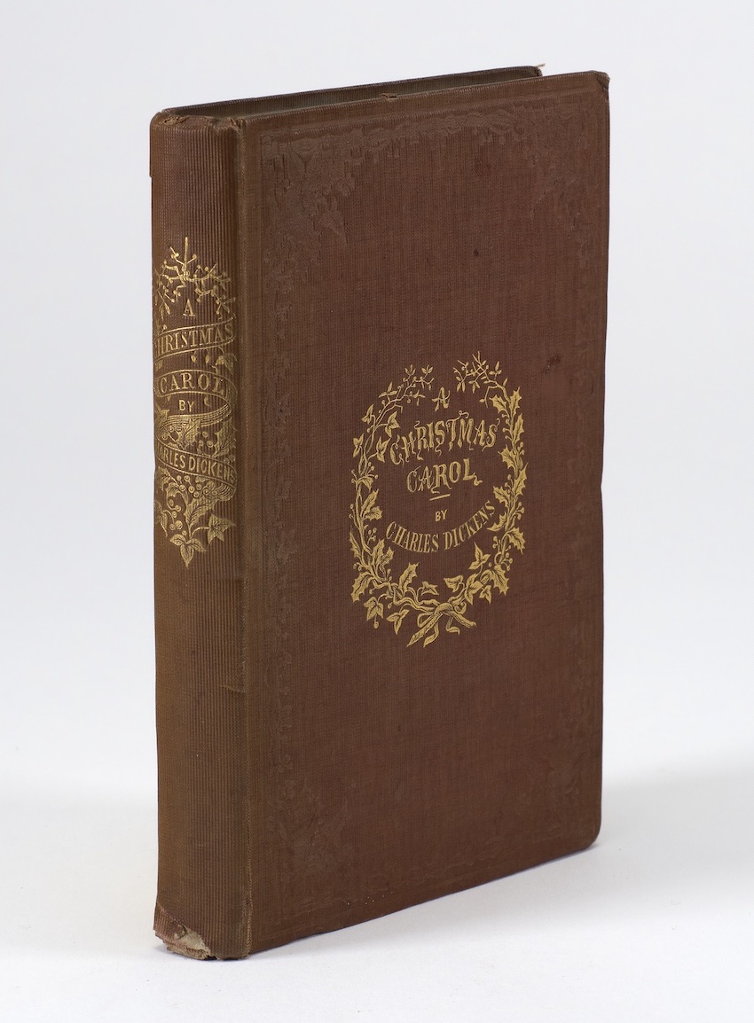 A Christmas Carol is the first issue, with uncorrected text (“Stave I” as the first chapter heading), the red and blue title page dated 1843, the half title printed in blue, and light green endpapers. The binding is Todd’s first impression, first issue, with the smallest interval between blind-stamped border and gilt wreath measuring 14-15 mm, and with the “D” in “Dickens” unbroken).