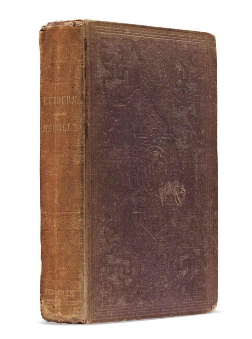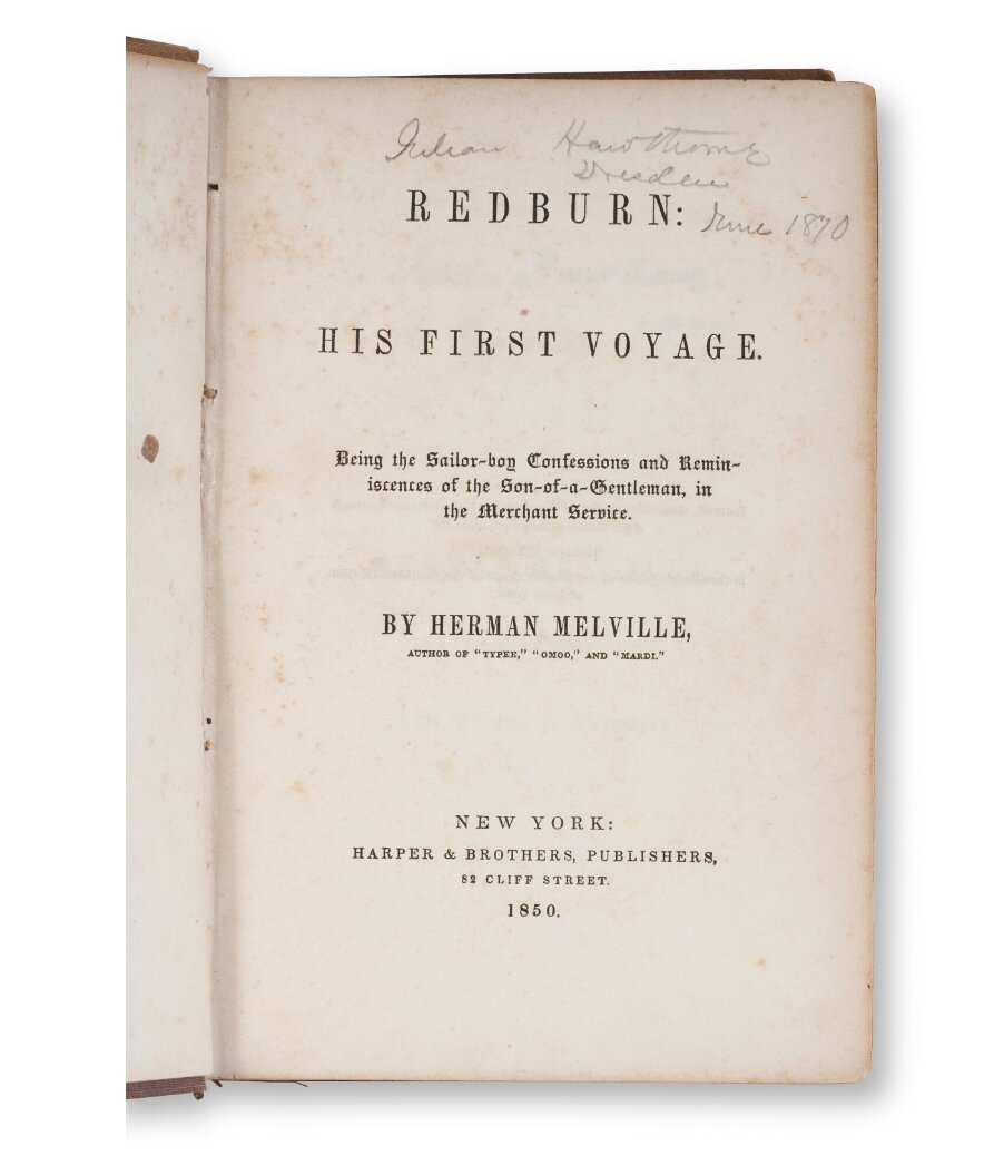 “An association copy linking two of the greatest figures in American literature” (Reese), this is Nathaniel Hawthorne’s copy of Herman Melville’s Redburn. The front free endpaper is inscribed: “Nath. Hawthorne from the Publisher.” The facing pastedown bears Melville’s clipped signature. Redburn, first published in 1849, is based on Melville’s experiences while on a cargo ship sailing to Liverpool in June 1839. It recounts the adventures of a son of a gentleman on his first voyage, living among coarse and sometimes brutal sailors.