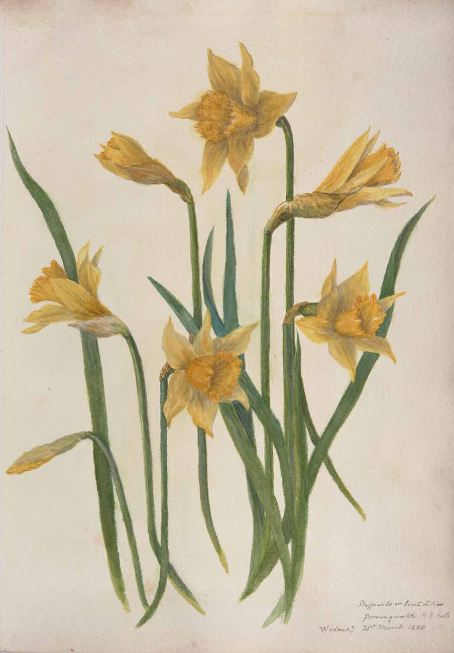 The album, the product of vast labor, contains 50 watercolors (all but four by Mrs. Huth) comprising studies of flowers, landscapes, and other scenes in Possingworth, East Sussex, and Scalpay (and other Hebridean locations); 70 photographs of buildings, landscapes, people, and paintings; and six pen-and-ink or pencil sketches. Many of the watercolors bear signatures, dates, and places. The album is filled with elegant calligraphic transcriptions of poems and prose pieces by Victorian writers (the Brownings being particular favorites), often with pen-and-ink floral borders. A number of the unsigned poems appear to be by Helen Rose Huth herself.