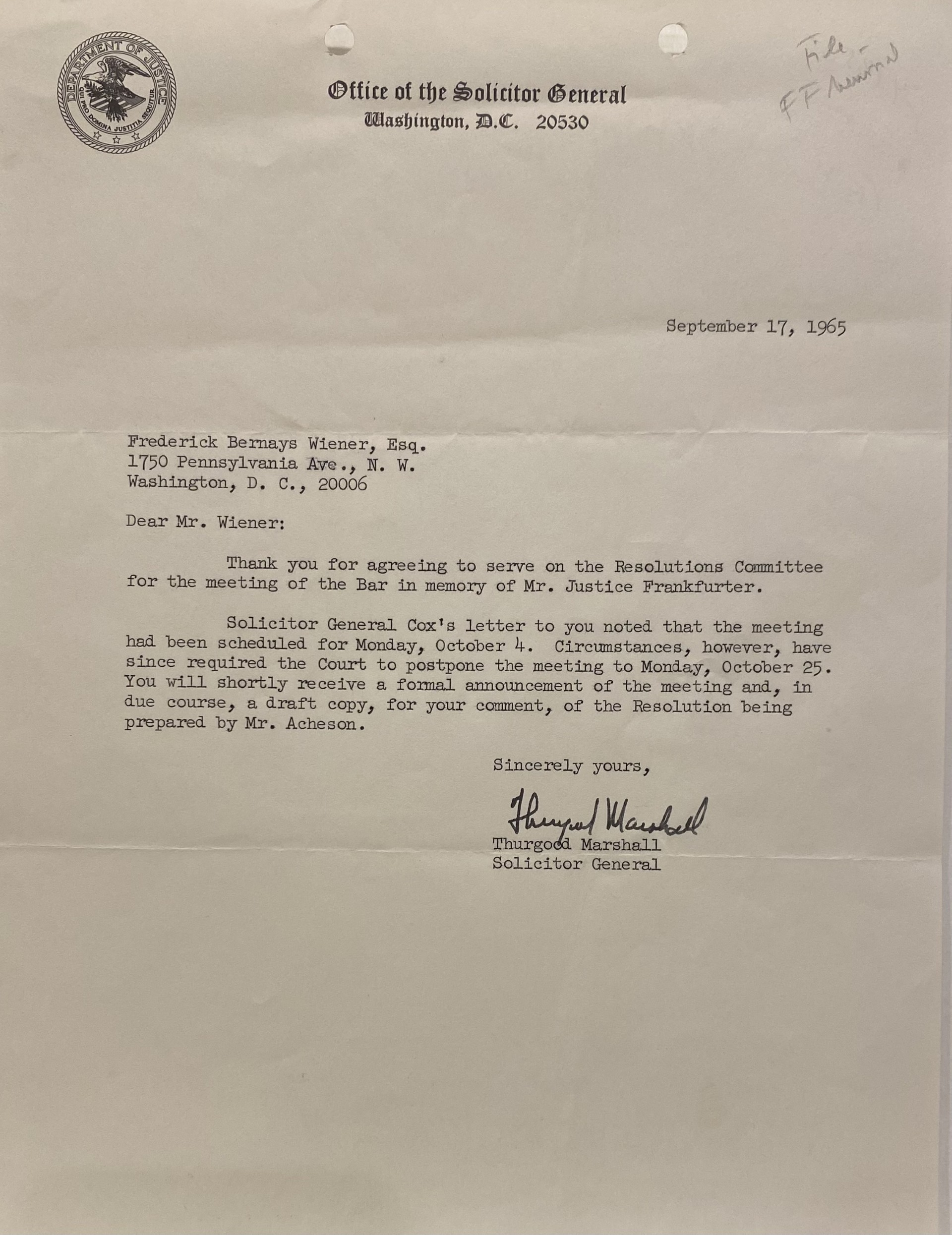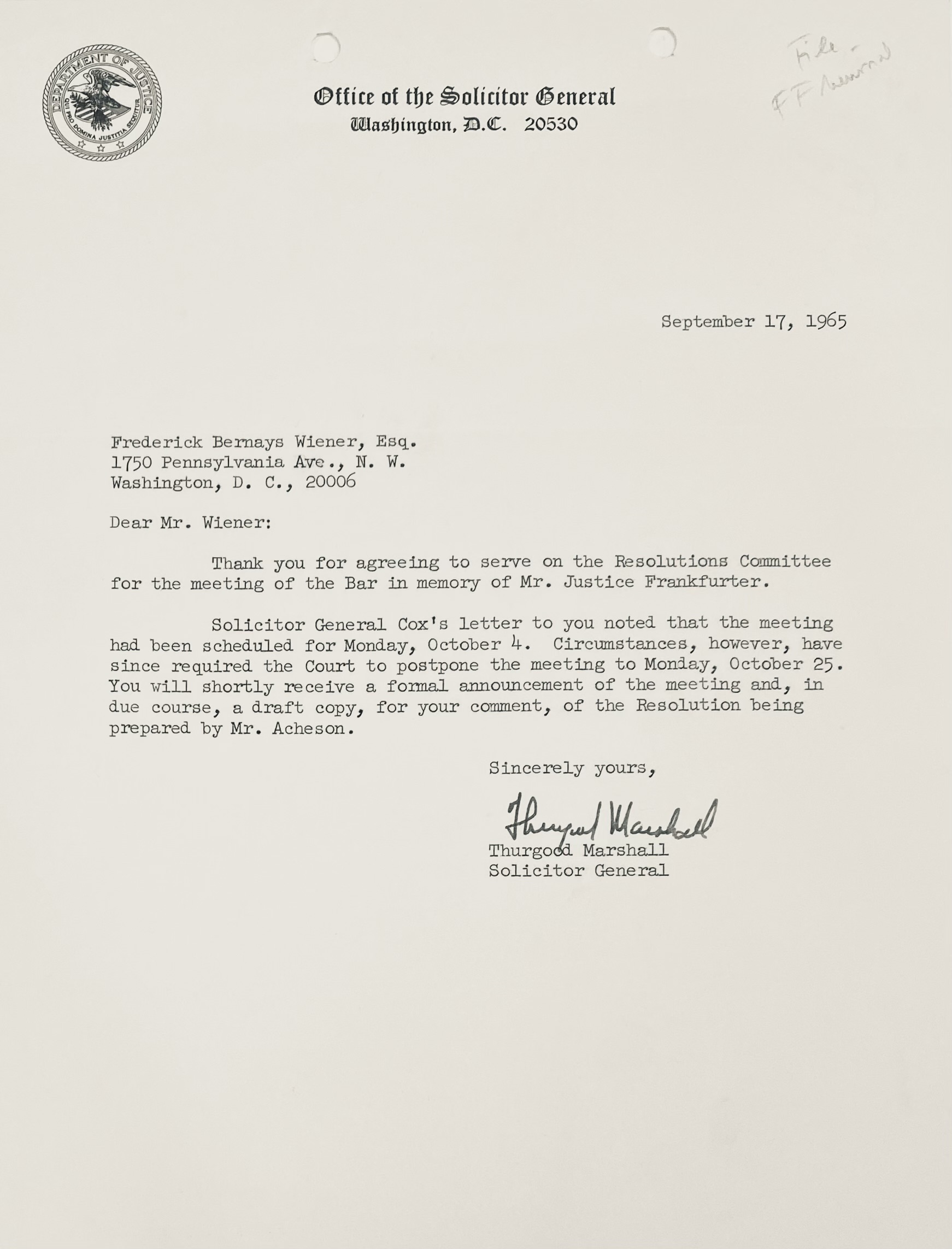Marshall thanks Wiener “for agreeing to serve on the Resolutions Committee for the meeting of the Bar in memory of Mr. Justice Frankfurter.” He goes on to discuss Solicitor General Archibald Cox’s previous letter concerning the event and notes that he will be sending a draft resolution prepared by Dean Acheson. The letter is accompanied by a printed, black-bordered mourning card concerning the October 11 meeting of the Bar to present its resolutions to the Court, at which time the Attorney General of the U.S. will address the Court.