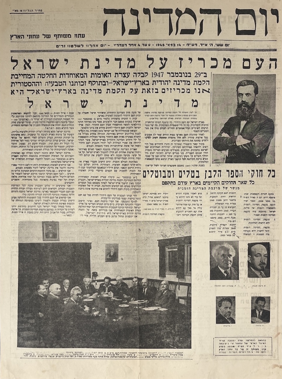 This newspaper broadsheet, headed Yom HaMedinah [Day of the State], was published jointly by the leading newspapers of the country on the day of the declaration of the state of Israel.