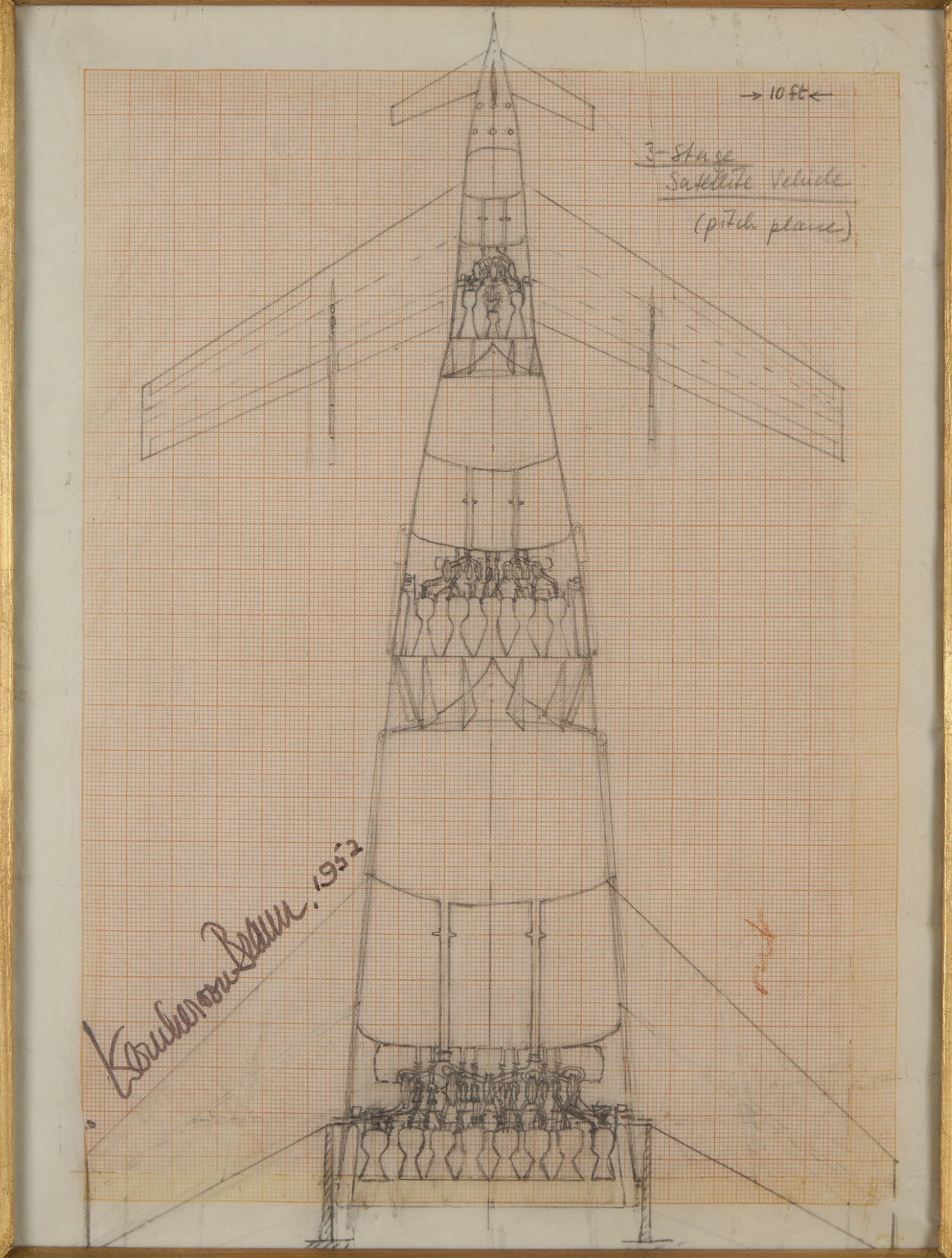 Original drawing, “3rd Stage Satellite Vehicle (landed),” signed and dated 1952.. Huntsville, Alabama,