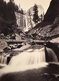 This beautiful album contains many splendid views of the scenic wonders of Yosemite. Subjects include the many magnificent falls, the Mariposa Grove of sequoias, and the great geological formations. At least two of the views in this collection were taken by Carleton Watkins. Those for which attribution to Watkins has been confirmed are singled out below, but this collection merits further investigation to identify Watkins photographs.