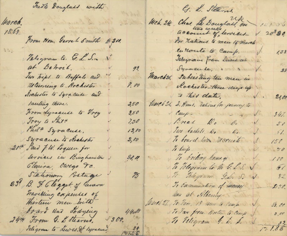 Autograph Manuscript Signed, comprising his list of men recruited for the 54th Massachusetts Infantry Regiment and an account of his travels and the resulting expenses in that effort.. Various places, March-August 1863