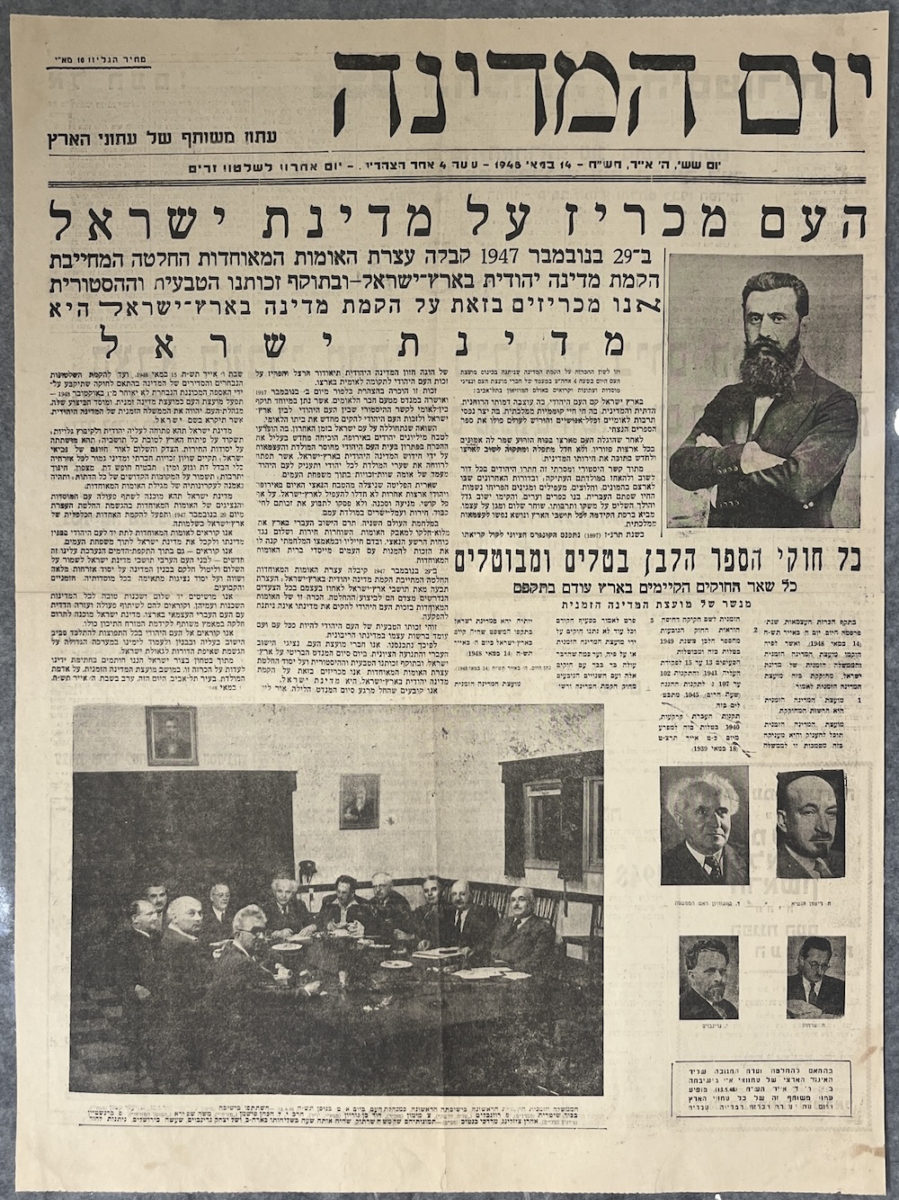 This newspaper broadsheet, headed Yom HaMedinah [Day of the State], was published jointly by the leading newspapers of the country on the day of the declaration of the state of Israel.