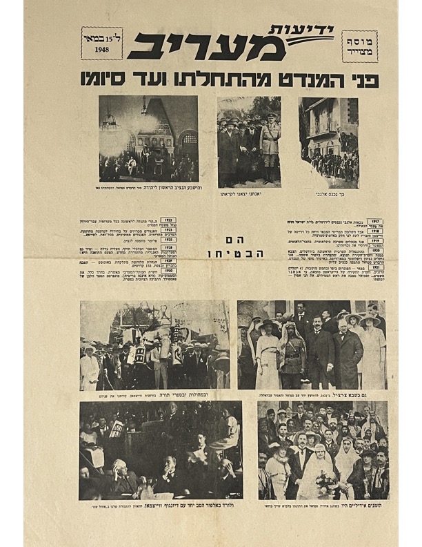 Ma’ariv was the most widely read newspaper in Israel for the two decades following the newspaper’s founding in 1948. This photo supplement was printed on the day of the declaration of the establishment of the State of Israel and attached as a “Sabbath Supplement” to that day’s issue.